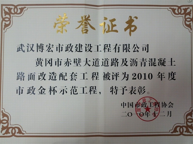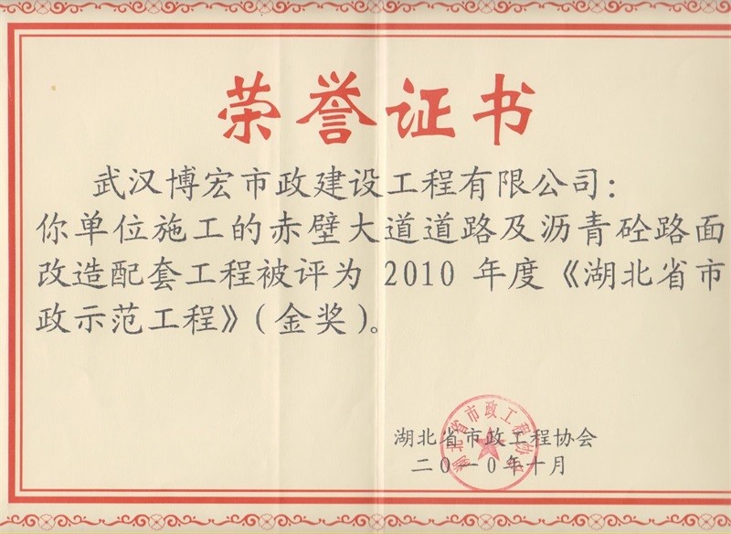 2010年度湖北省市政示范工程金獎(jiǎng)(赤壁大道道路及瀝青砼路面改造配套工程)