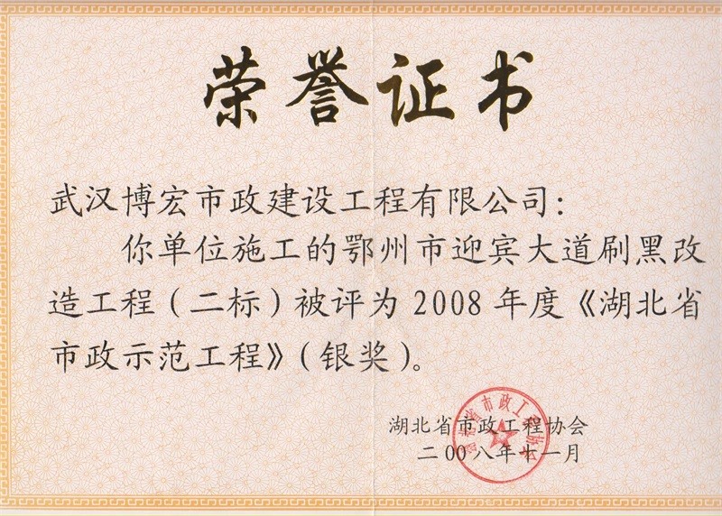 2008年度湖北省市政示范工程銀獎(jiǎng)(鄂州市迎賓大道刷黑改造工程二標(biāo))