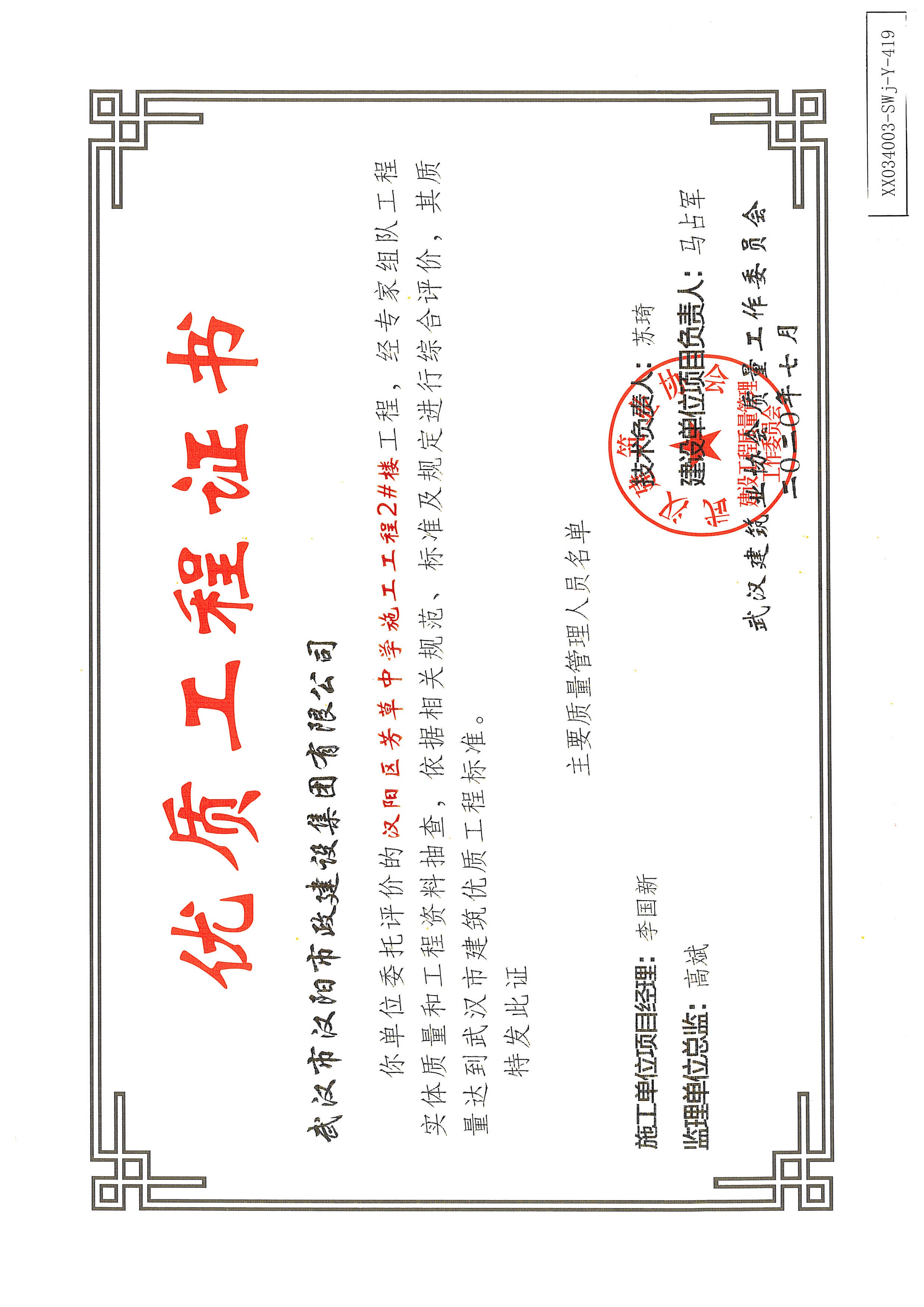 優(yōu)質(zhì)工程證書(shū)(武漢四新中學(xué)建設(shè)項(xiàng)目(教學(xué)樓)