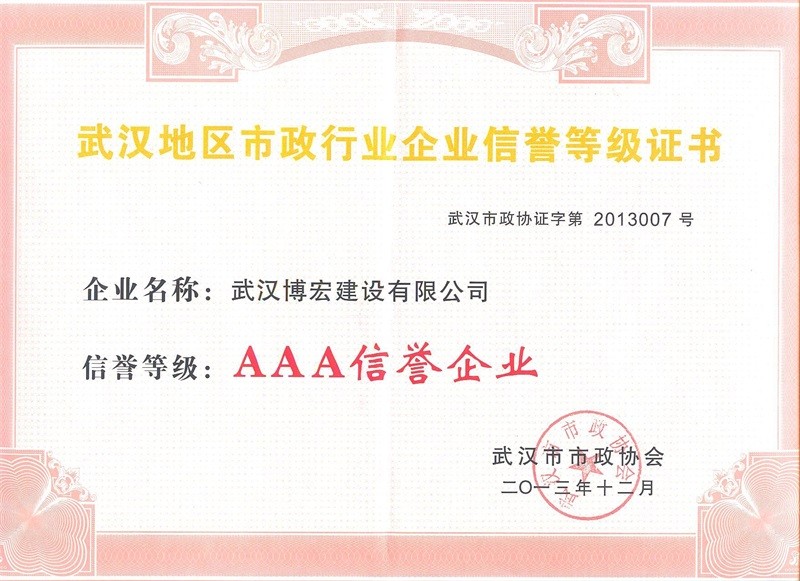 2013年度武漢地區(qū)市政行業(yè)企業(yè)信譽(yù)等級(jí)證書